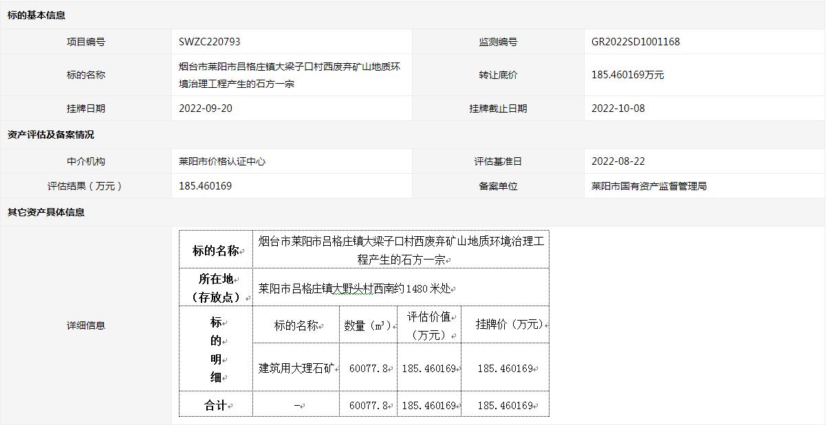 烟台市莱阳市吕格庄镇大梁子口村西废弃矿山地质环境治理工程产生的石方一宗