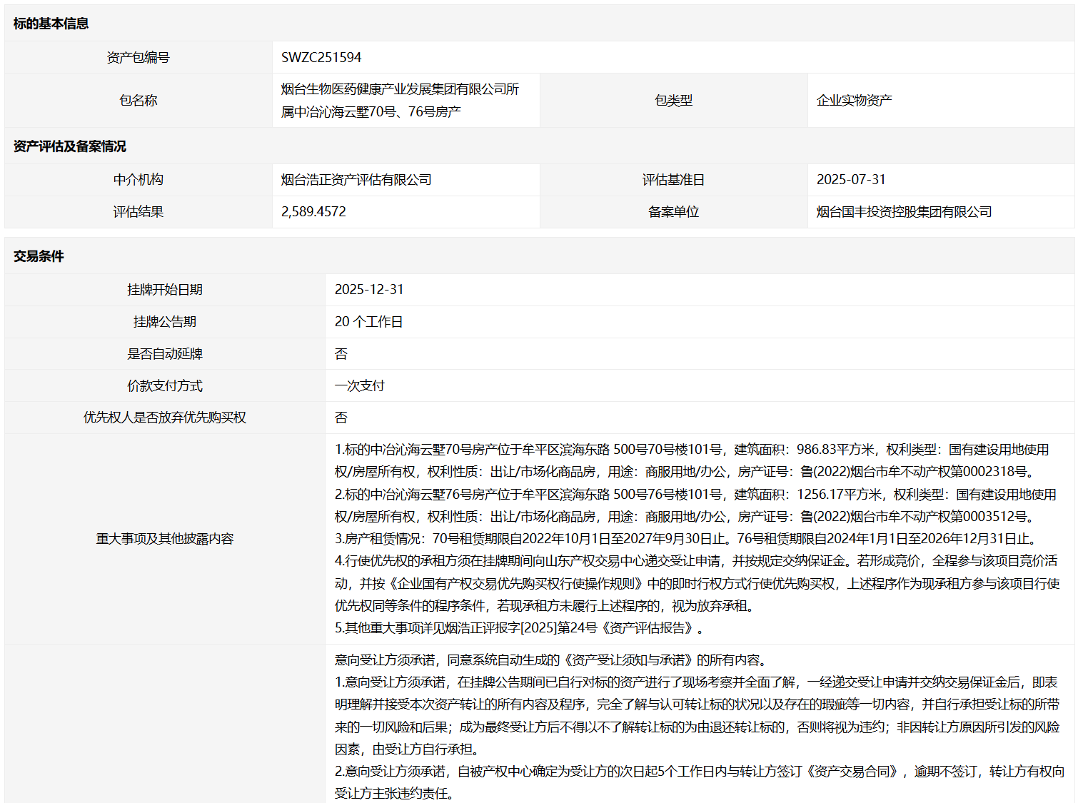 烟台生物医药健康产业发展集团有限公司所属中冶沁海云墅70号、76号房产
