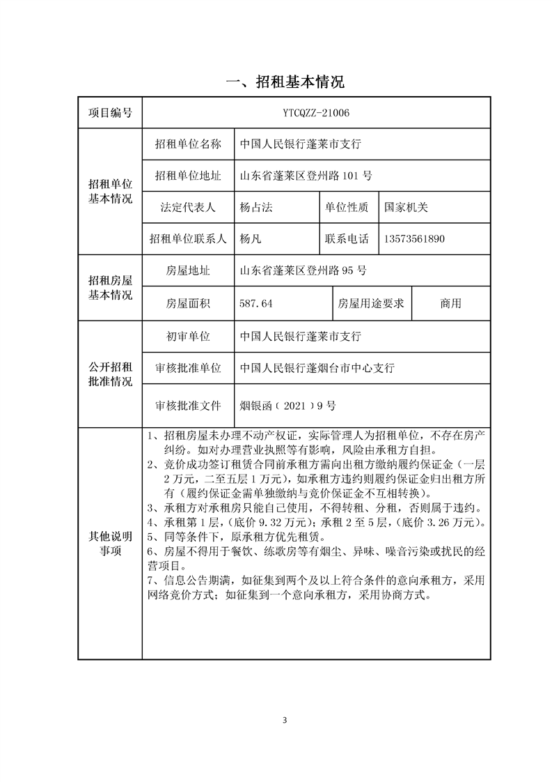中国人民银行蓬莱市支行登州路95号(南)半部分招租(一层)