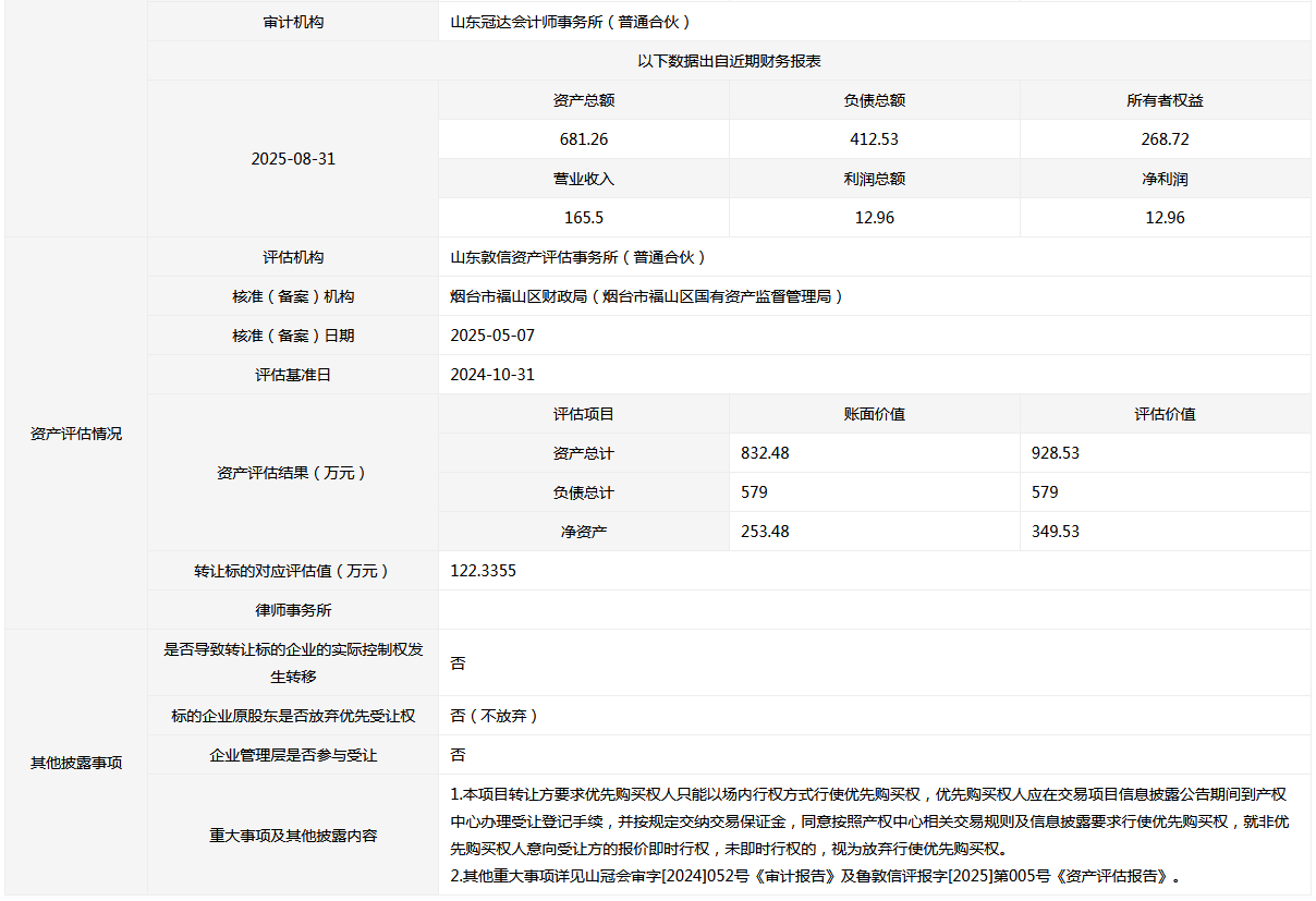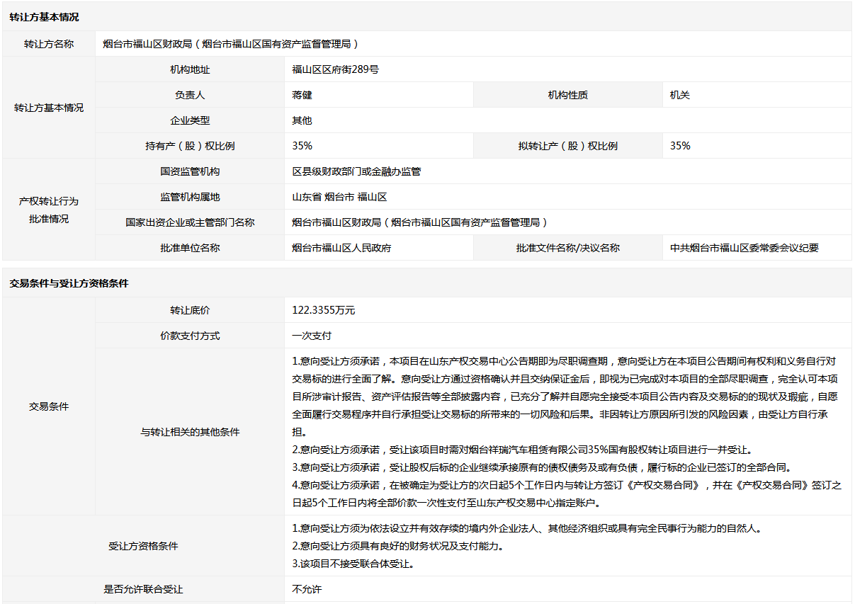 转让方: 烟台市福山区财政局(烟台市福山区国有资产监督管理局)