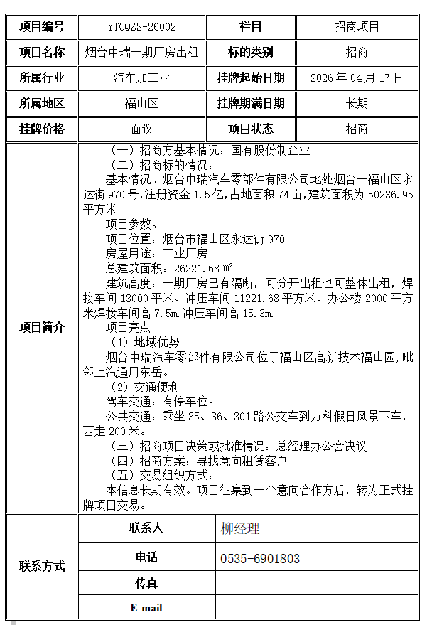 烟台中瑞一期厂房出租招商公告